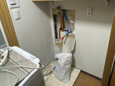 開口調査の結果、洗濯給水管から漏水と判明